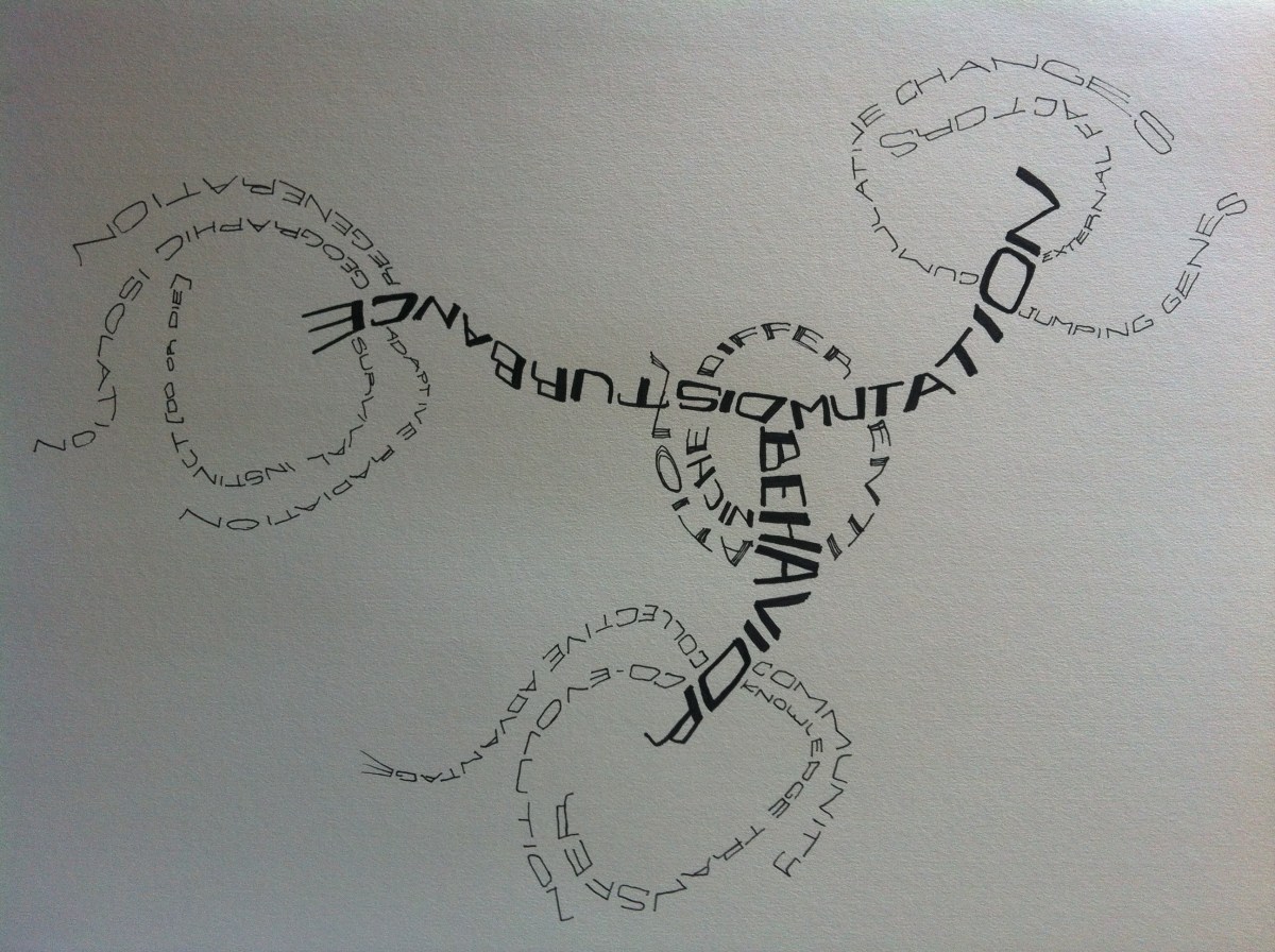 1. La sobreposición de los elementos (context, chance y receta) nos hizo entender que había componentes siempre presentes en la evolución: los disturbios (disturbance), el comportamiento (behavior) y la mutación (mutation). Durante nuestra inmersión a la naturaleza científica encontramos estrategias exitosas que se relacionan con uno o más elementos, en el centro la diferenciación por nicho (niche diferentiation).